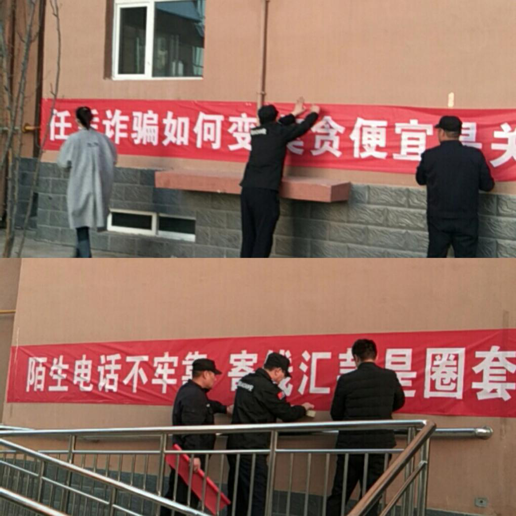 在豐源居小區(qū)組織物業(yè)人員懸掛防范電信詐騙條幅、樓道張貼防范電信詐騙相關內容,挨家挨戶進行宣傳講解,通過多種方法使大家的防騙意識入腦入心,減少案件發(fā)生,保障群眾的財產安全。
